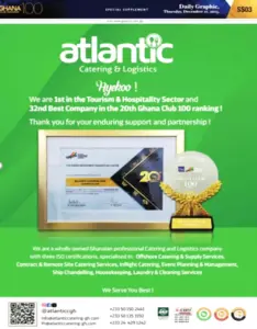 Atlantic Catering & Logistics as First in Hospitality & Tourism and 32nd in the overall ranking at the 2023 Ghana Club 100 Awards